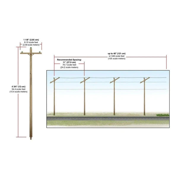 Each pole is placed approx. 80 scale feet apart or 11" (27.9 cm) in HO scale.