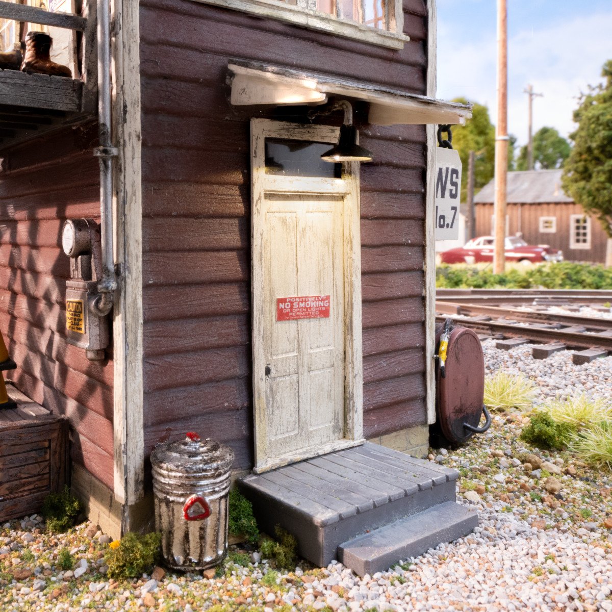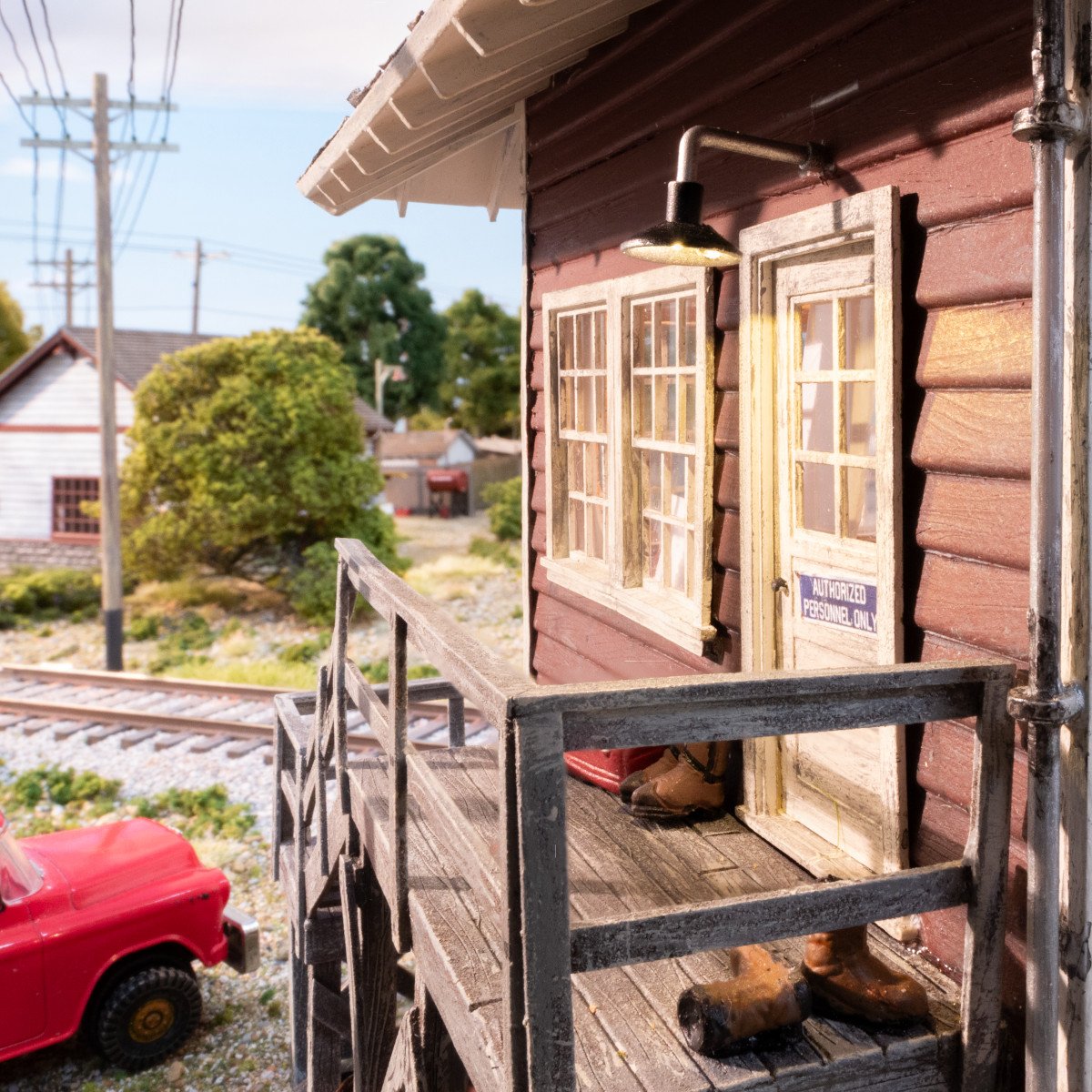 The exterior of the two-story Interlocking Tower is loaded with authentic details, including a weathered, shingled roof, an identification sign stating "WS No. 7" and an upper deck with staircase to the ground level. Tires, a spool of wire, water hose, diesel tank and barrels give proof to the daily activity at the Tower, including a toolbox and a pair of boots on the deck outside the upstairs cabin door.