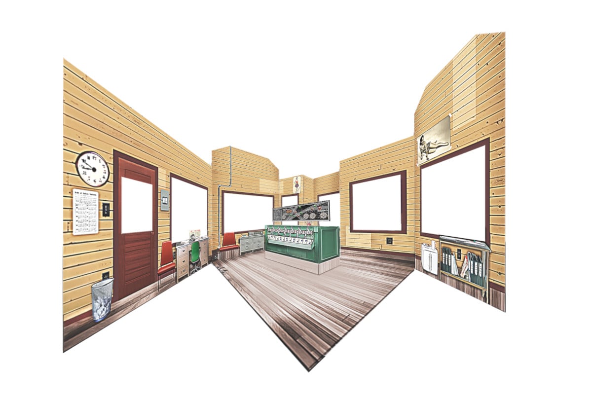 The interlocking machine's model board sits in the center of the tower's upstairs cabin and is visible from 360 degrees through windows on all sides. The operator's office desk, a wood stove, lanterns and additional features, such as pin-up posters and a calendar, can also be seen.